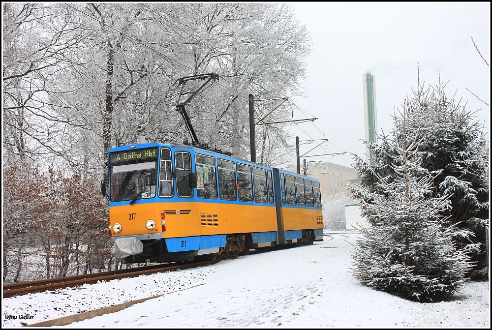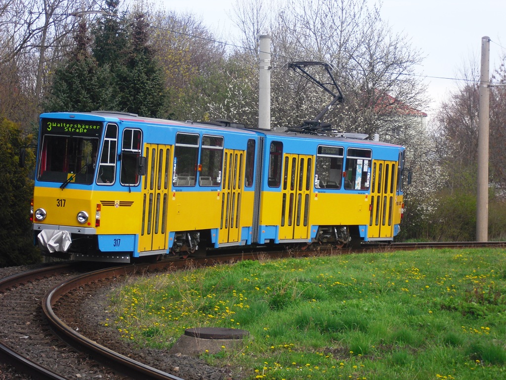 Ehemaliger Triebwagen 543 der Erfurter Verkehrsbetriebe AG. In Gotha wurde Tw 317 zum unechten Zweirichtungstriebwagen umgebaut und modernisiert. Seit Februar 2012 ist er wieder im Fahrgasteinsatz.