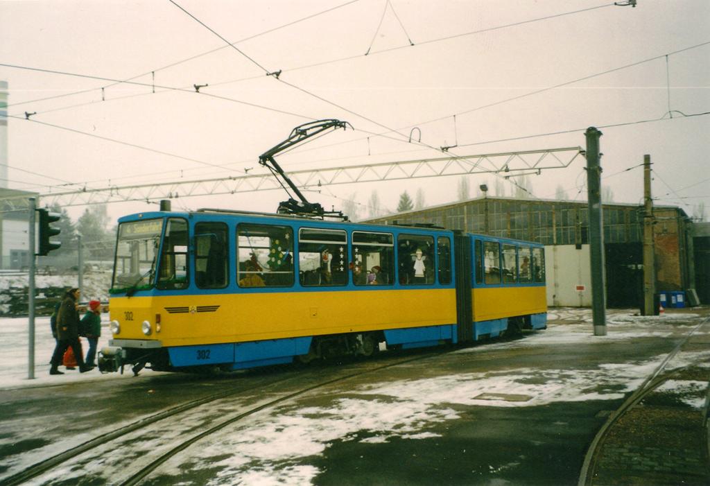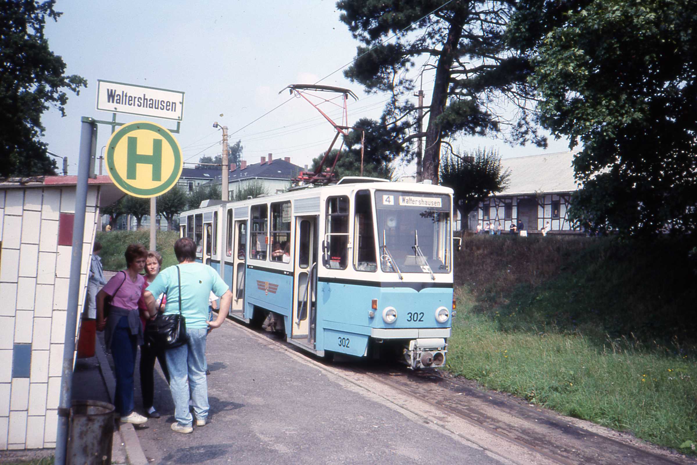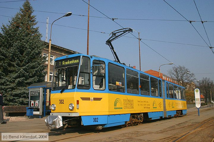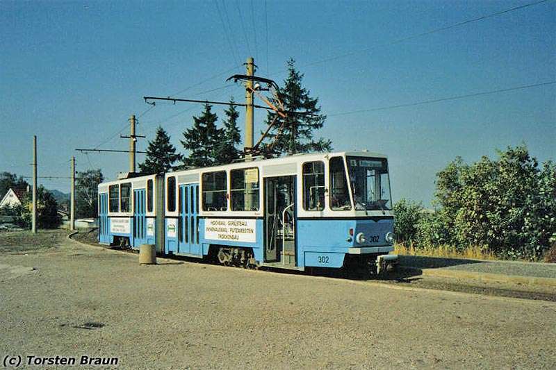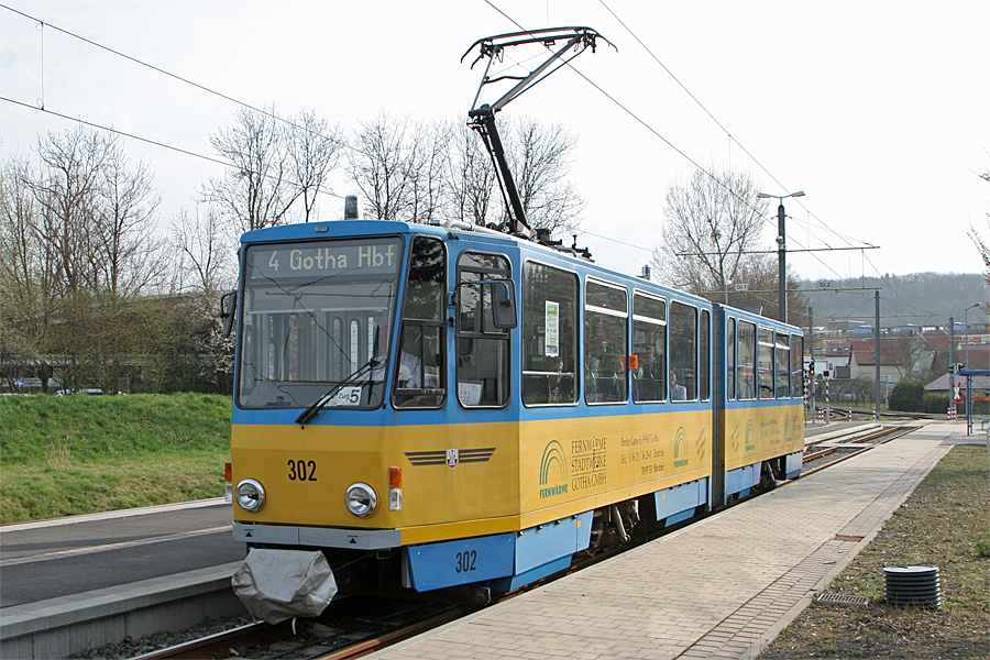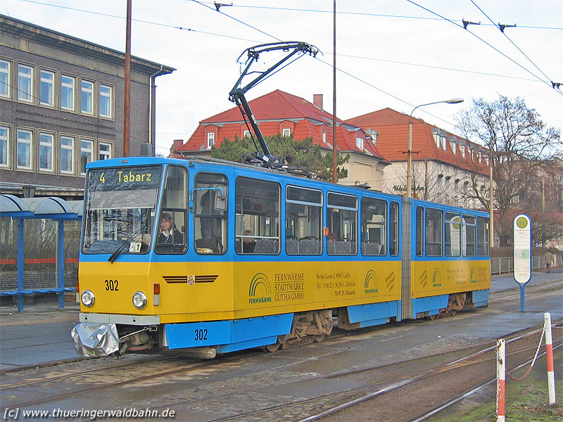 Ursprünglich im Farbschema “blau-weiß” der Straßenbahn Gotha. TW 301 bis 306 wurden 1997-2000 in Eigenarbeit durch die Thüringerwaldbahn und Straßenbahn Gotha GmbH in Zusammenarbeit mit Kiepe-Elektronik vollständig modernisiert.