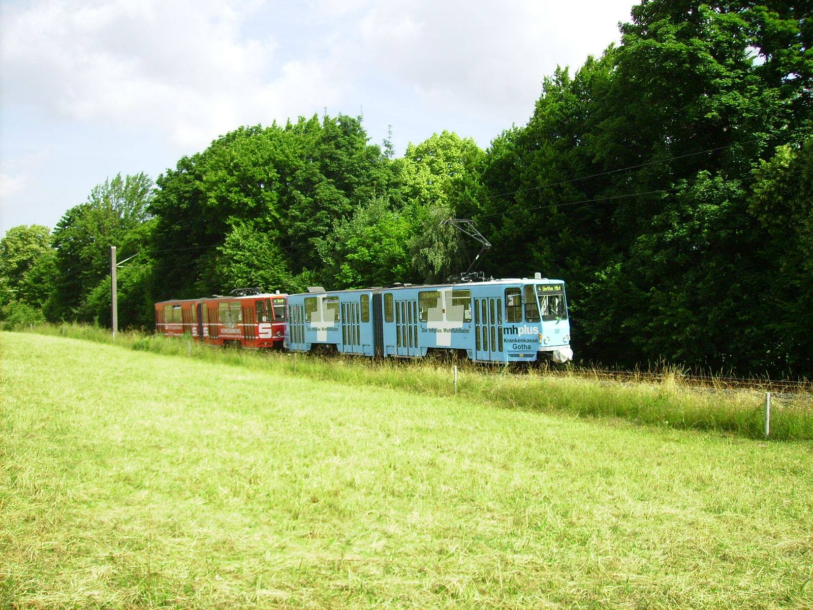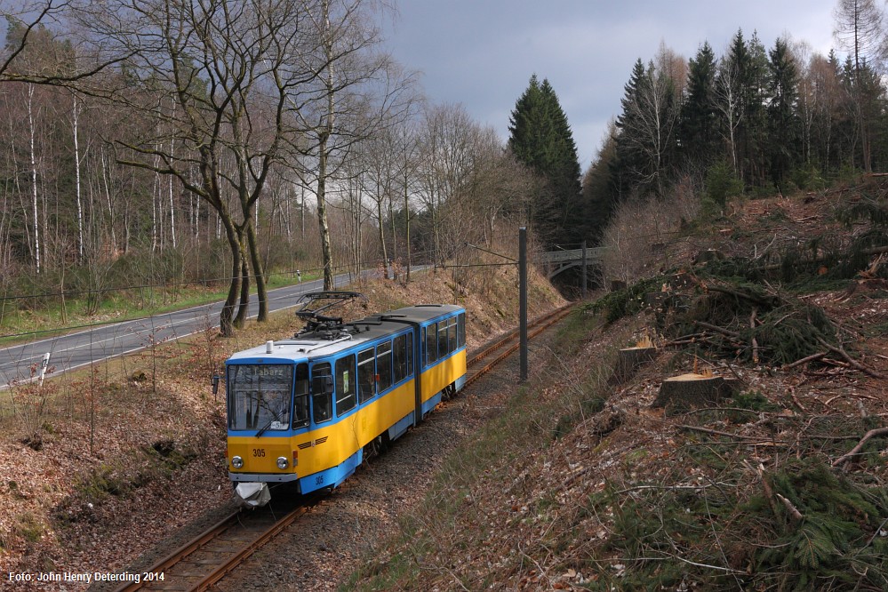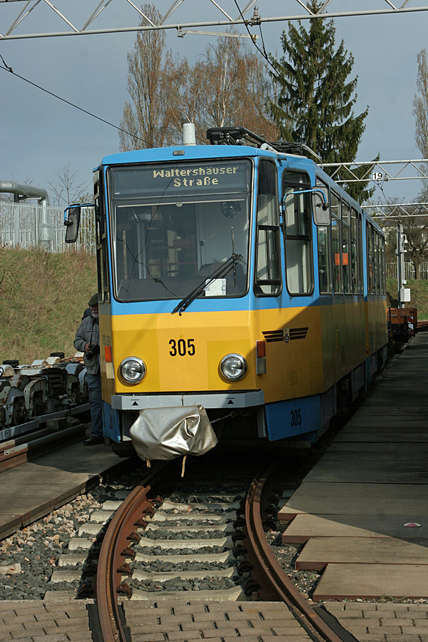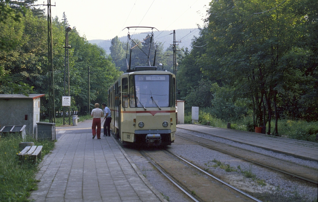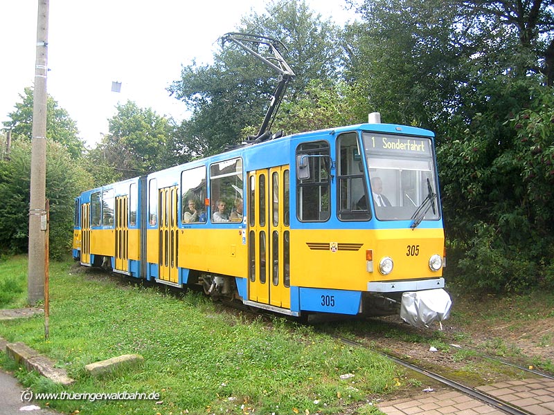 Ursprünglich im Farbschema “gelb-weiß” der Thüringerwaldbahnbahn. TW 301 bis 306 wurden 1997-2000 in Eigenarbeit durch die Thüringerwaldbahn und Straßenbahn Gotha GmbH vollständig modernisiert.
