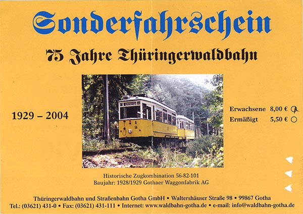 Am Sonntag, den 12. 09. 2004 feierte die Thüringerwaldbahn im Rahmen des “offenen Denkmals” ihr 75-jähriges Jubiläum, zusammen mit dem 110-jährigen Bestehen der Straßenbahn Gotha.
