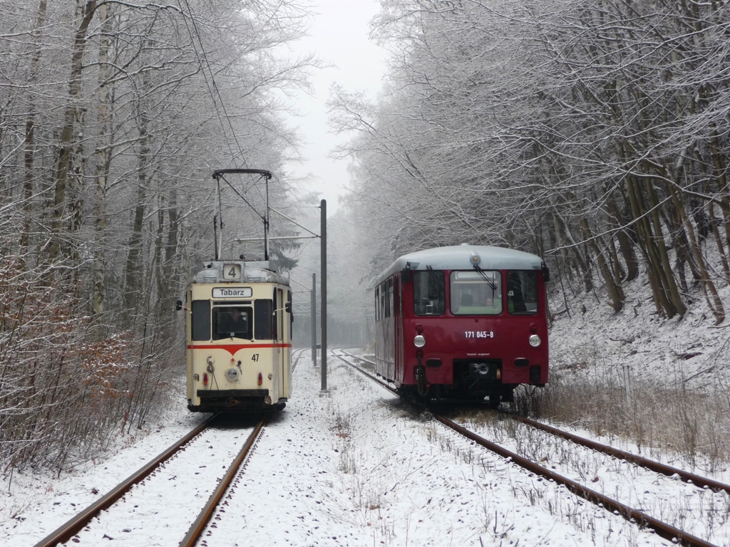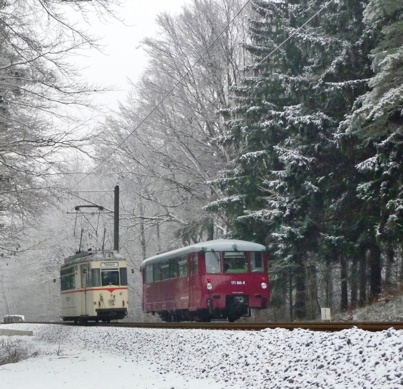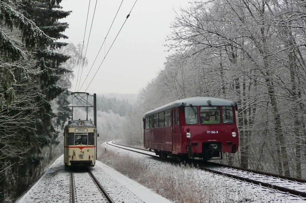 Tw 47 und EBS 772 345, zwischen Reinhardsbrunn und Schnepfenthal, 25.01.2014 (2), (C) Quaß