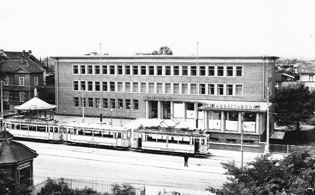 Tw 51 + Bw 80, Tw 50, Gotha Hbf (im Hintergrund Theleg Verwaltungsgebäude, ca. 1938, (c) Bräunlich, Slg. P. Kalbe