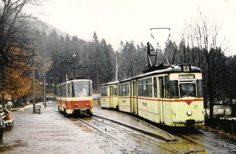 Tw/Bw 211-70 und Tw 302 in der Haltestelle Friedrichroda (damals noch Ausweiche), März 1985 (C) D. Kirchberger