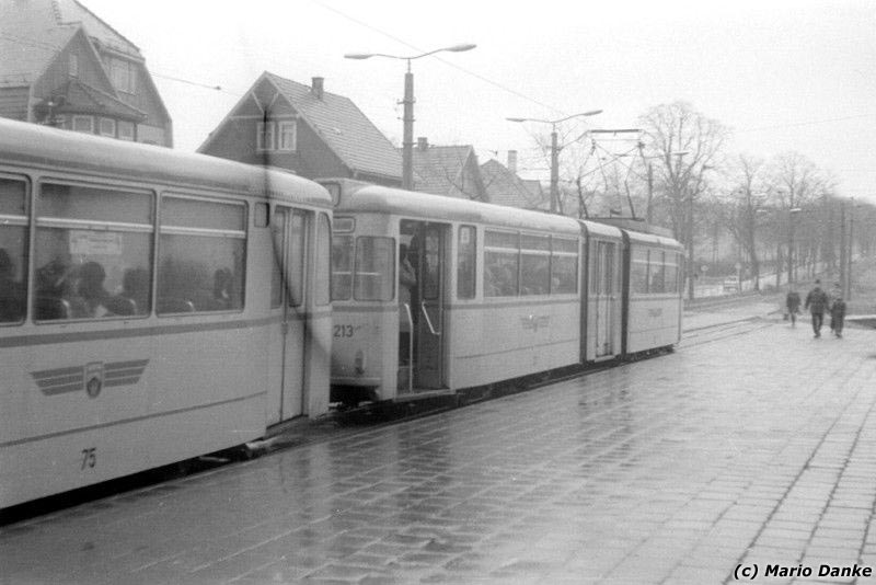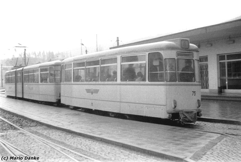 Im Februar 1974 war ich im Thüringen im Winterurlaub, statt Schnee gabs aber bloß Nieselregen, nur ganz oben am Rennsteig waren ein paar Flocken. Als alter Straßenbahnfan nutzte ich die Zeit für ein paar Schnappschüsse von Gothaer Gothawagen. Damals hatte ich eine uralte Kleinbildkamera mit ORWO NP20 geladen, Farbfilme waren für mein schmales Taschengeld schlicht unerschwinglich.