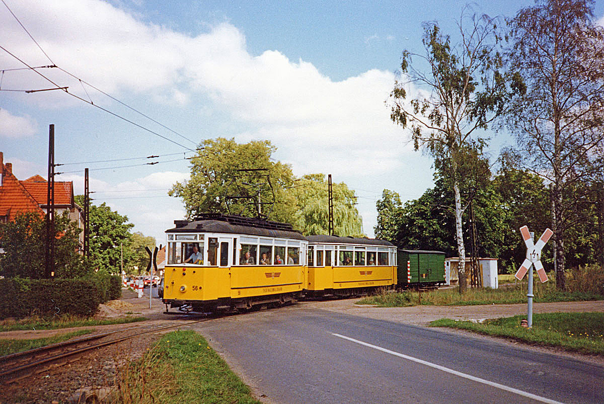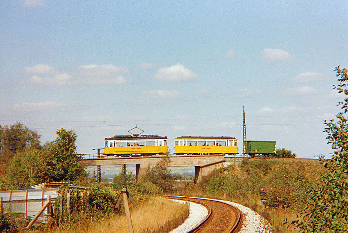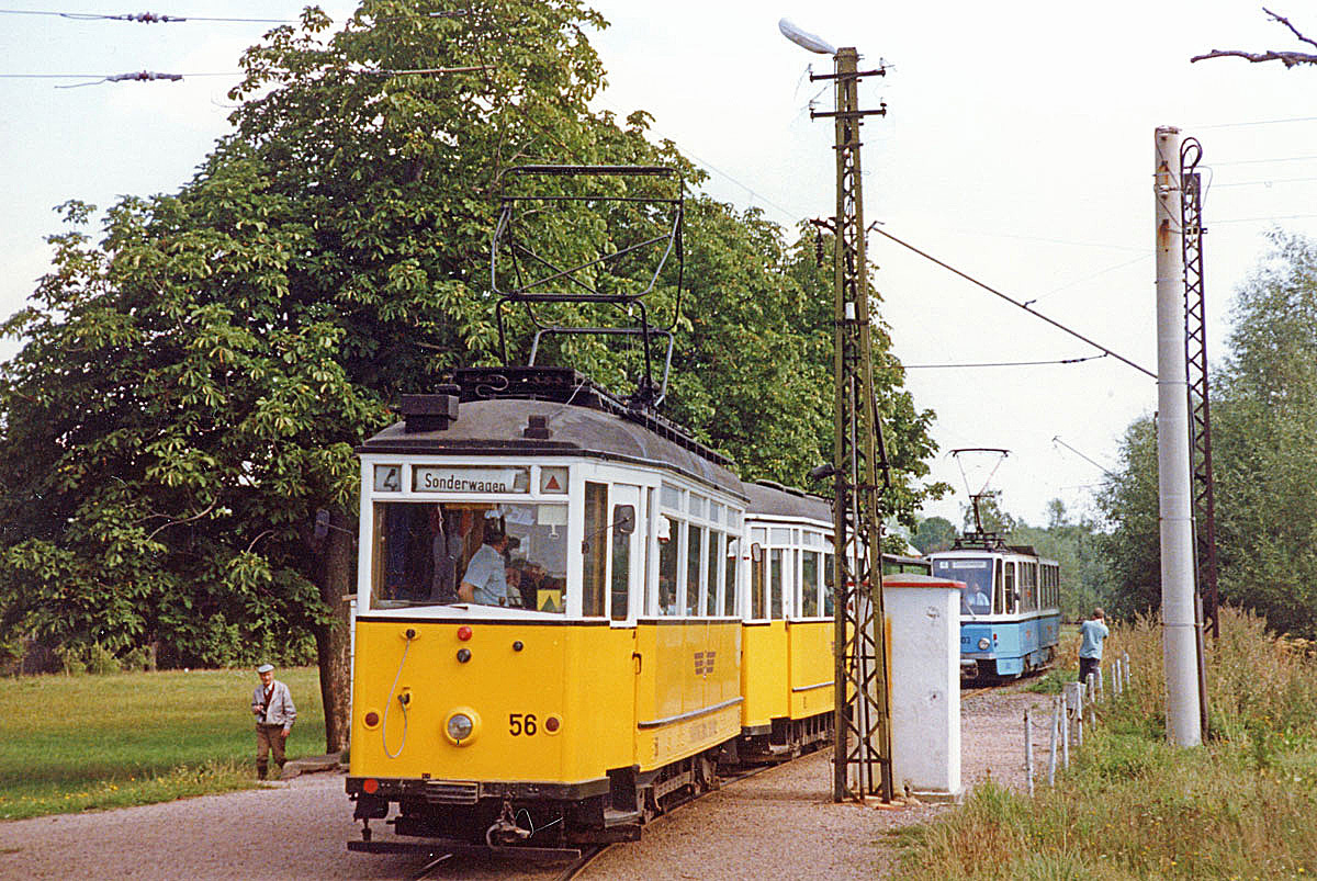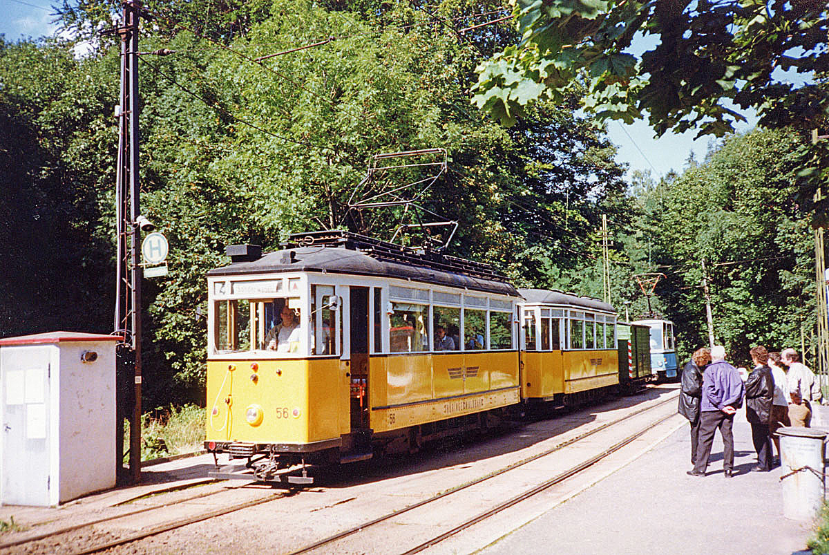 Am Gleisdreieck begegnet uns GT6 TW 592 (DUEWAG 1959), 1994 es BOGESTRA Bochum. Ein Jahr später wurde auch dieses Fahrzeug, welches damals den Anschluss nach Walterhausen darstellte, verschrottet.
