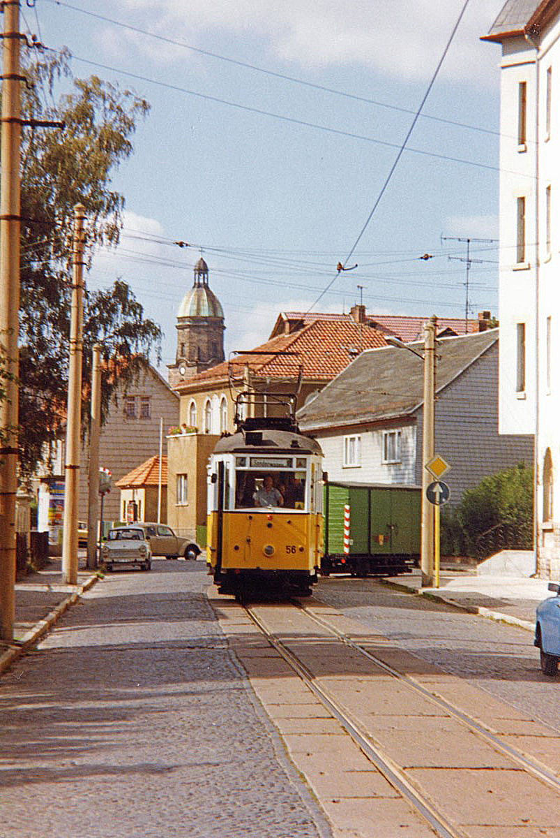 Am Gleisdreieck überholte uns der Planzug mit Tw 210 (G4-67 2+2xGlTwER 1967 VEB Gotha, a:1994. Wurde an eine Brauerei in Ilmenau verkauft, dort zwischenzeitlich verschrottet)