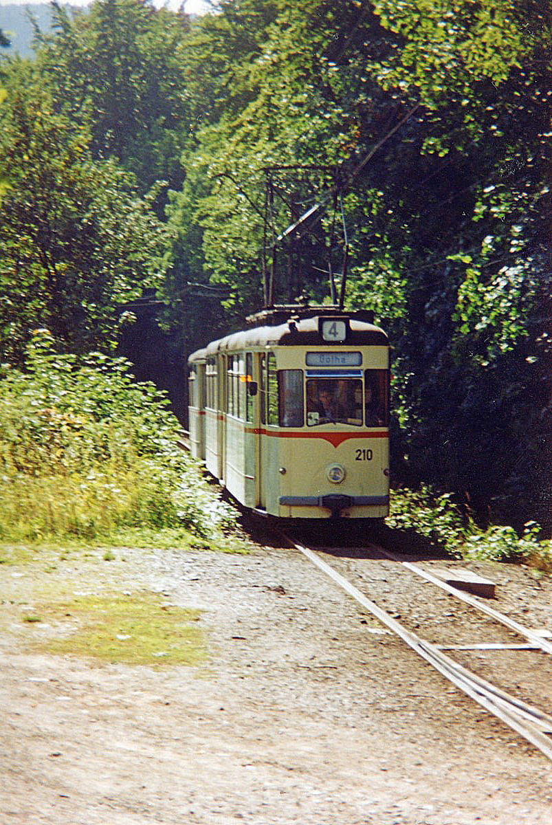Tw 215 folgt uns als Planzug kurz vor Tabarz. Der Wagen gehört aktuell zum Museumsbestand (G4-67 2+2xGlTwER VEB Gotha 1967, Überlandausführung, 2001 restauriert, seit 01/2002 HTw