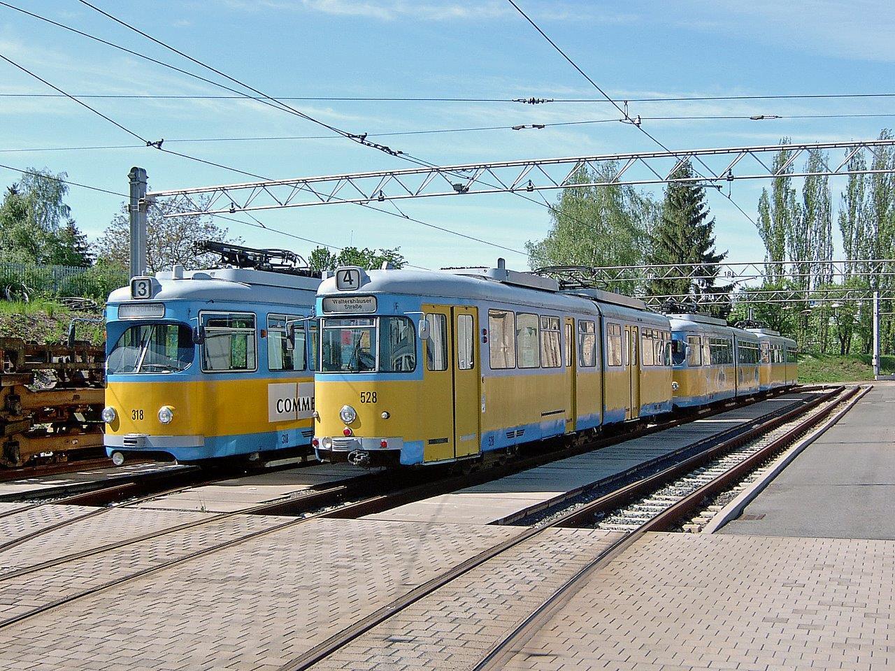 TW 318 (DUEWAG 1960) ex Mannheim 318, ex Heidelberg 201 (verschrottet 2011) und 528 (DUEWAG 1962) ex Bochum, 2007 an IG Hirschbergbahn im Betriebshof abgestellt
