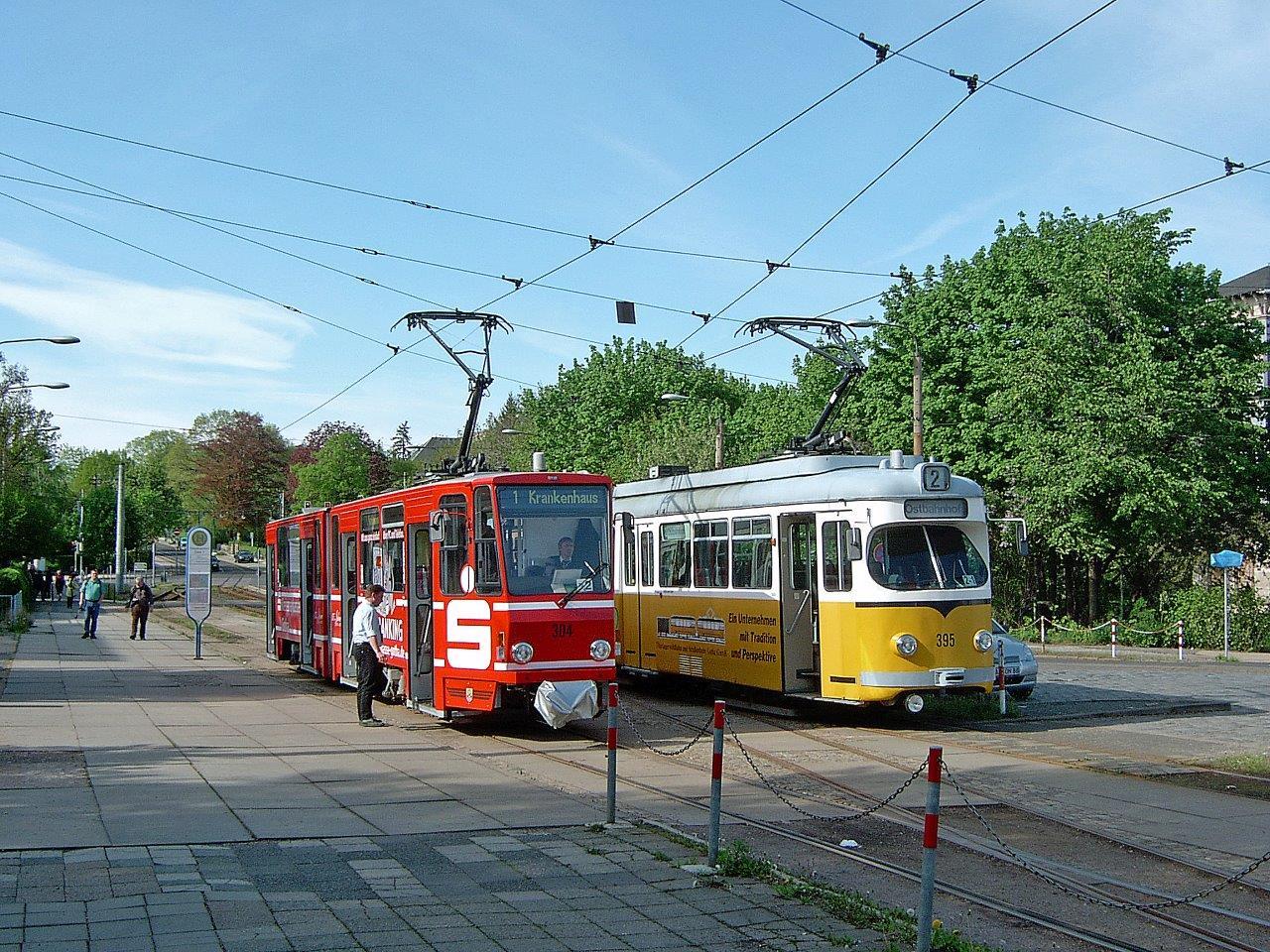 Kreuzung mit Tw 308 und 309 (beide CKD 1990 ex Erfurt 538 und 539) in der Haltestelle Marienglashöhle