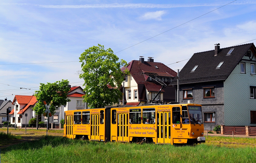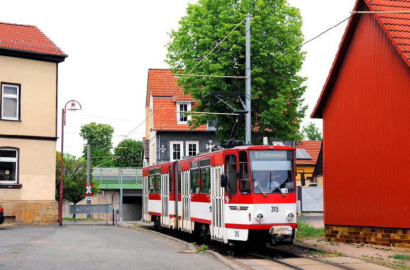 Im Ortsbereich von Sundhausen verläuft die Thüringerwaldbahn zwischen den Häusern des kleinen Ortes hindurch. Am 21. Mai 2016 ist hier der Tatra Triebwagen mit der Nummer 315 im Einsatz.