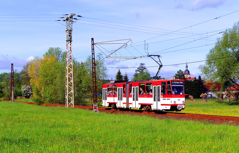 Nahe der kleinen Ortschaft Wahlwinkel rollt der Tatra Triebwagen mit der Nummer 308 am 21. Mai 2016 in Richtung Waltershausen. Diese weiß/rot lackierten Triebwagen fuhren zuletzt in der Landeshauptstadt Erfurt und tragen auch noch das Farbkleid der Erfurter Verkehrsbetriebe.