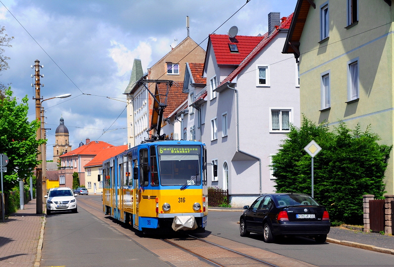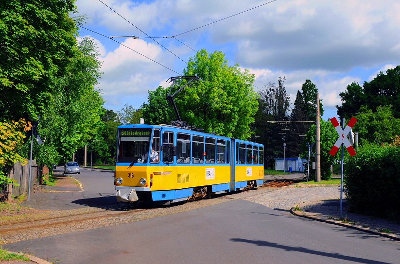 Der Triebwagen mit der Nummer 316 hat soeben den Bahnhof von Waltershausen verlassen und fährt in die Albrechtstraße ein (21. Mai 2016).