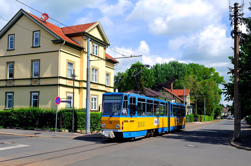 Bevor die Reise mit der Thüringerwaldbahn in Richtung Bad Tabarz weitergeht, wenden wir uns kurz der Linie 6 in Richtung Waltershausen (Bahnhof) zu, die in Waltershausen (Gleisdreieck) ihren Ausgangspunkt hat. Am 21.Mai 2016 war für die Linie 6 der Tatra Triebwagen mit der Nummer 316 (CKD Prag, Baujahr 1990) dort im Einsatz.